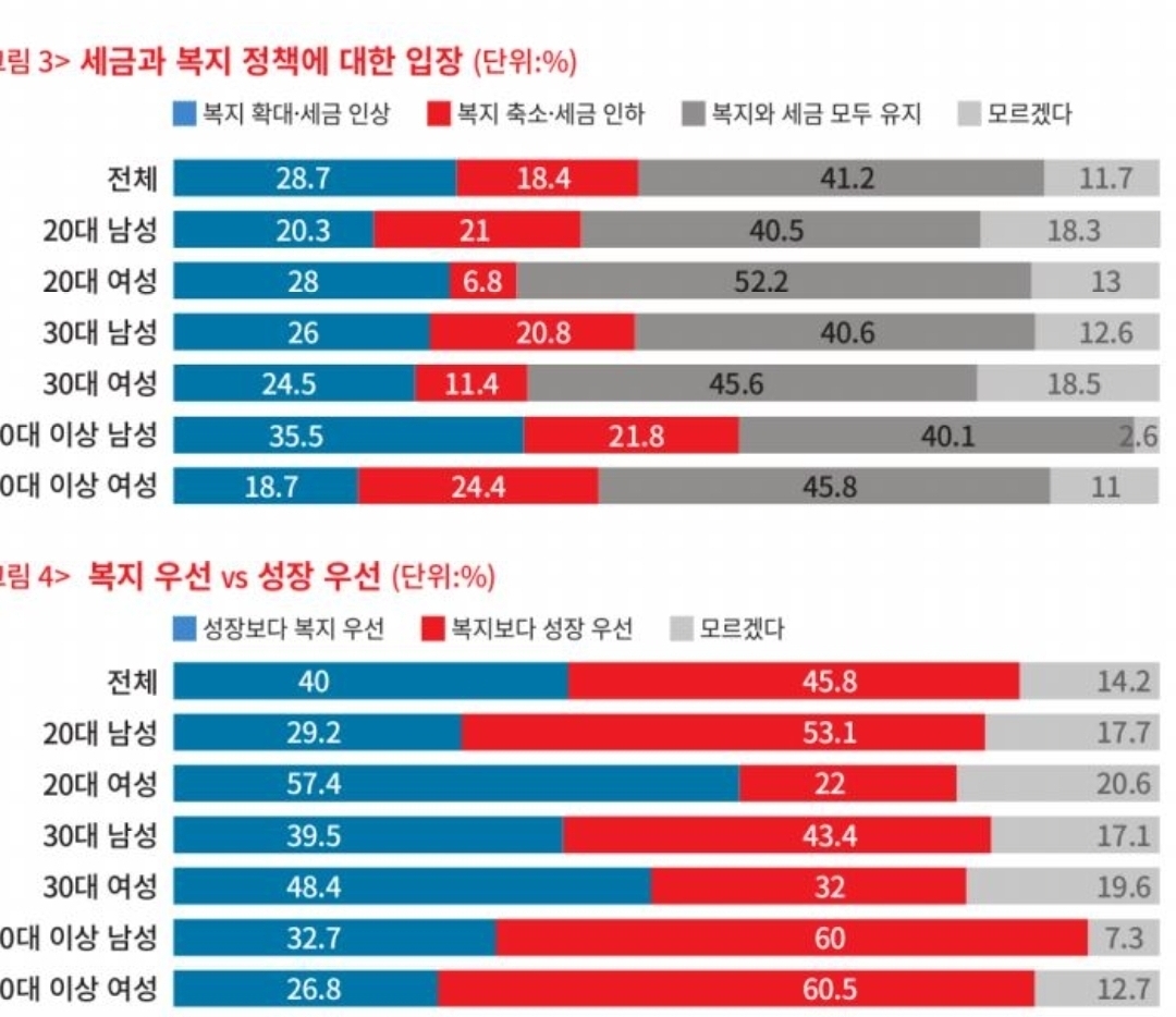 2030 남성 세대는 대체로 복지보다는 성장 위주의 경제관을 가지고 있습니다. 40대 이상 세대에게서 성장 우선이 나오는 이유야 그 당시엔 한국 경제가 실제로 지금에 비해 많이 뒤떨어졌기 때문에 그러한 관성이라고 볼 수 있다면 2030의 경제 성장 우선은 어떤 면에선 특기할만한 경향성이죠.