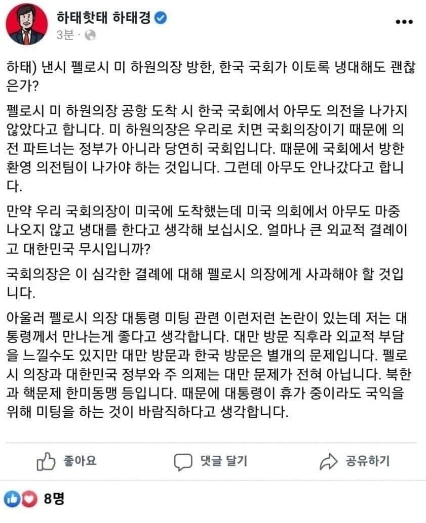 뿐만 아니라 위 발언 중 펠로시의 파트너는 국회의장이고 국회에서 대응해야 한다는 말은 그런 접견 채널을 공식적으로 열어주는 행위가 됩니다. 즉, 민주당이 미국통이 될 가능성이 높다는 이야기가 되죠. 국힘당 쪽이 그렇게 될 수도 있지 않겠냐고요? 그럼 지금 같은 상황이 나와서는 안 되고, 애초에 국제외교에 대한 이해도와 인식이 매우 뒤떨어졌습니다.