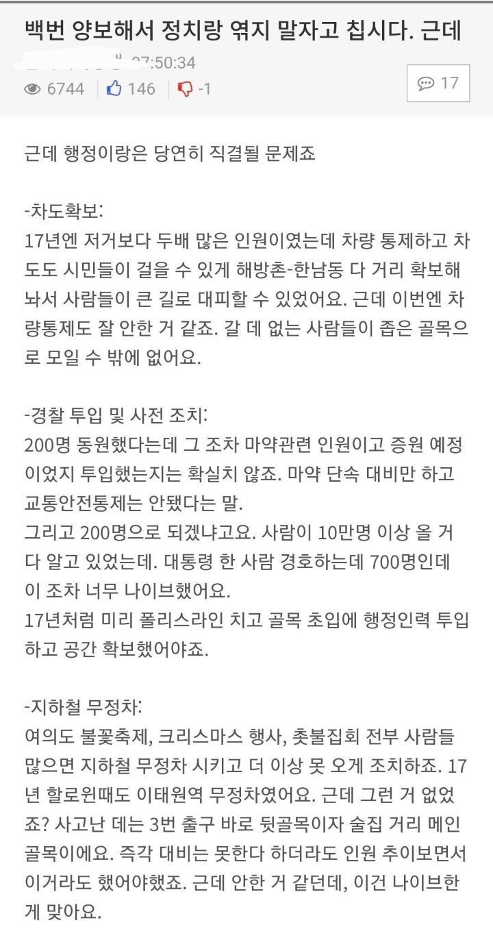 근데 인명사고에서, 안전과 관계된 영역에서 사람이 죽었음에도 경찰-행정당국-시장에게 책임을 묻지 않는다는 건 그저 정치적으로 편파적인 무책임 그 자체입니다.