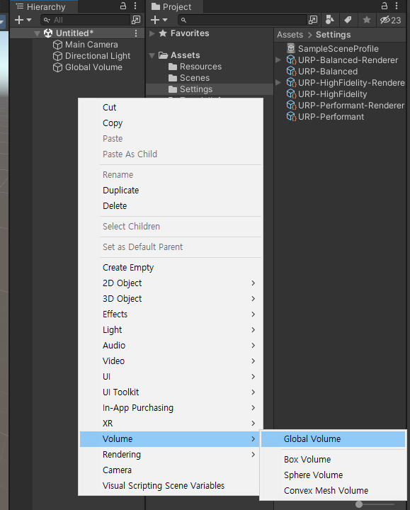 포스트 프로세싱 기능은 볼륨에서 글로벌 볼륨을 만들어주는 것으로 사용 가능합니다.