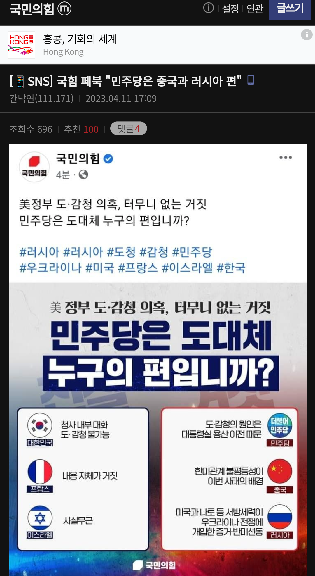 국민의힘은 이를 왜곡 선동하며 도, 감청 사건에 대해 미국에 책임소재를 묻고 국익으로 환산하거나 정부의 보안 실패에 책임을 묻고 재정비하는 대신 그 분란의 화살을 민주당에 돌려 국내 정치화 하는 것입니다.
