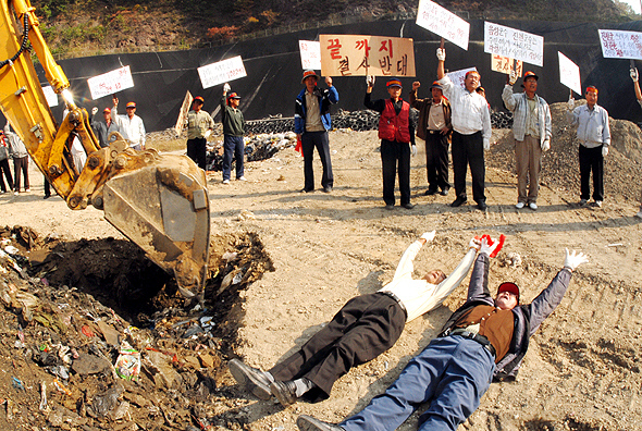 보도에 따르면 이 사진은 충북 진천·음성군의 폐기물종합처리장 추가시설 조성에 반대해 맹동면 통동리 등 인근 주민들이 굴착기를 동원해 매립장 설치 반대 시위 사흘째를 담은 것이다.