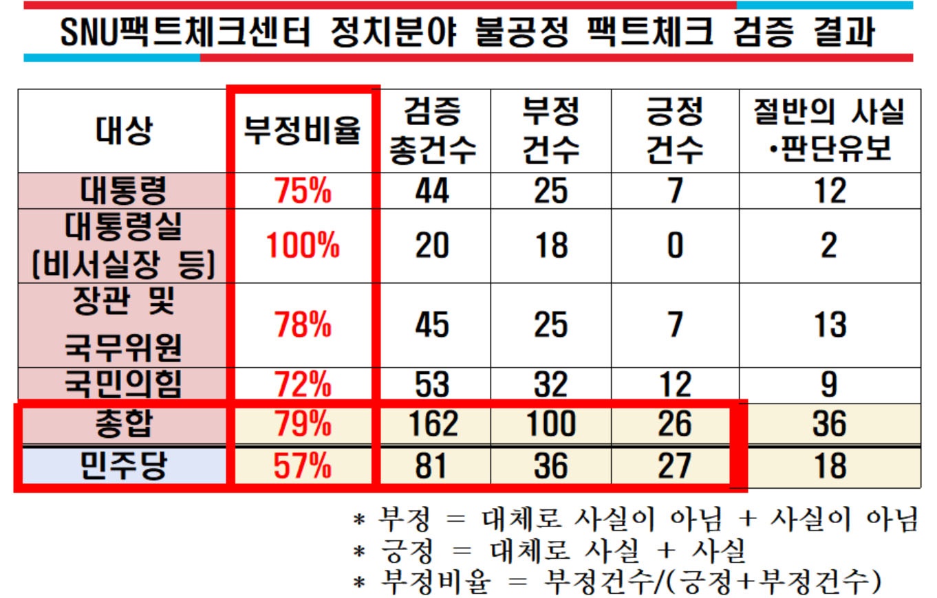 윤석열 대통령과 대통령실 수석들, 국민의힘 정치인 발언에 대한 언론사들의 팩트체크 결과, 부정('전혀 사실 아님'과 '대체로 사실 아님') 판정 비율이 80%에 육박한다는 사실을 공표해 버렸기 때문이다.