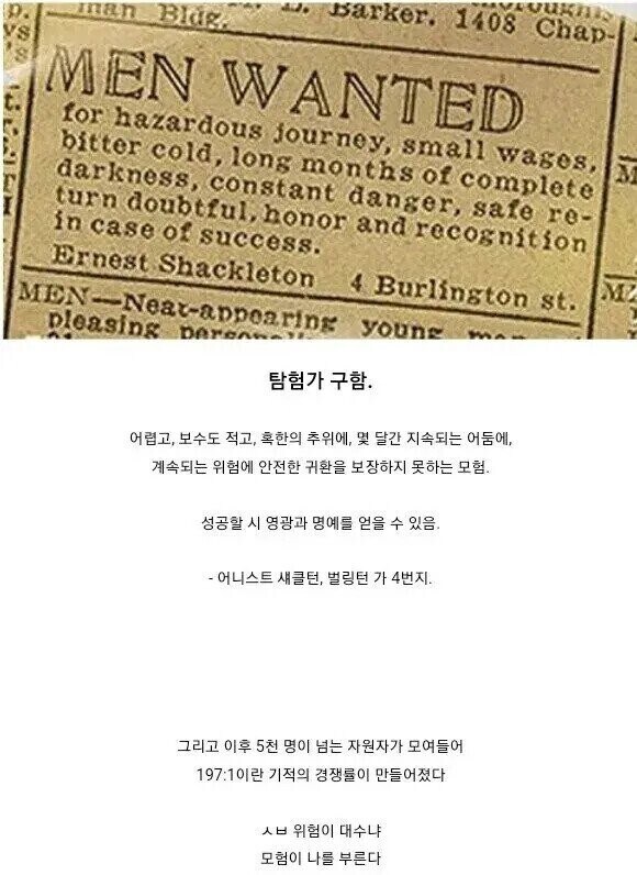 '인간은 위대한 여행을 원한다'라는 첫 구절을 보고, 미안한데 웃음이 나왔다. 'Men Wanted'라고 '사람 구함', 곧 '구인'이라고 제목 써 붙인 것을 저렇게 철학적으로 옮겨 놓았다. 그리고 아래에 보니 '헌정된 신문광고'라고 했다. '헌정'이라면 섀클턴을 기리기 위하여 누가 광고를 집행했다는 것인데 이상하지 않은가. 번역된 책의 원저의 원문을 찾아보니 'attributed to Ernest Shackleton'이라고 되어 있다. 섀클턴에 의하여 집행되었다든지 만들어졌다고 'implemented by', ' run by', 'created by' 등의 동사를 쓰면 되었을 것 같은데 왜 굳이 'attributed to'라고 '결부된', '연관된' 식의 모호하게 해석될 수 있는 표현을 썼을까.