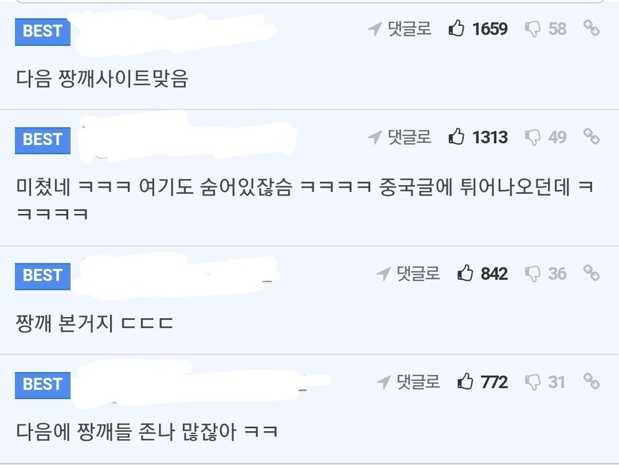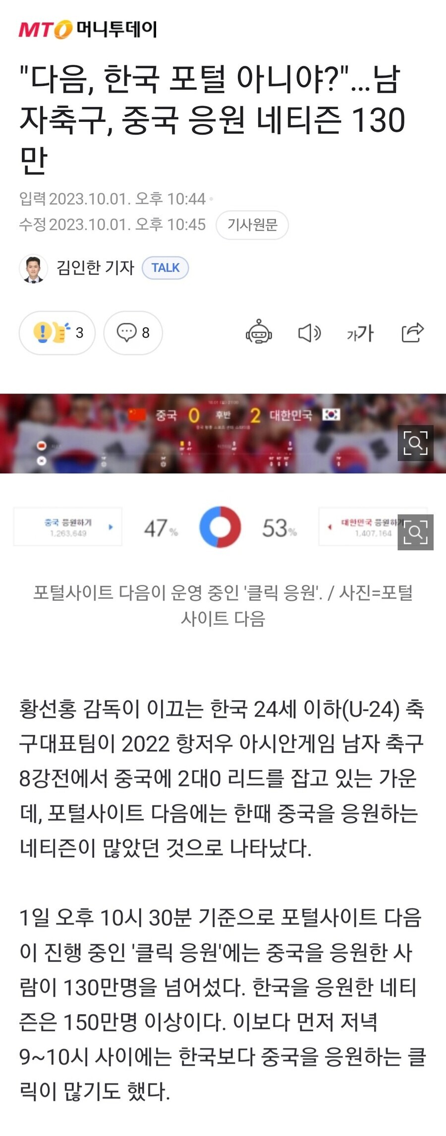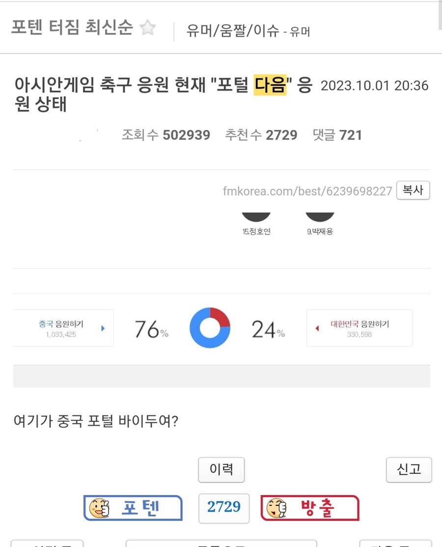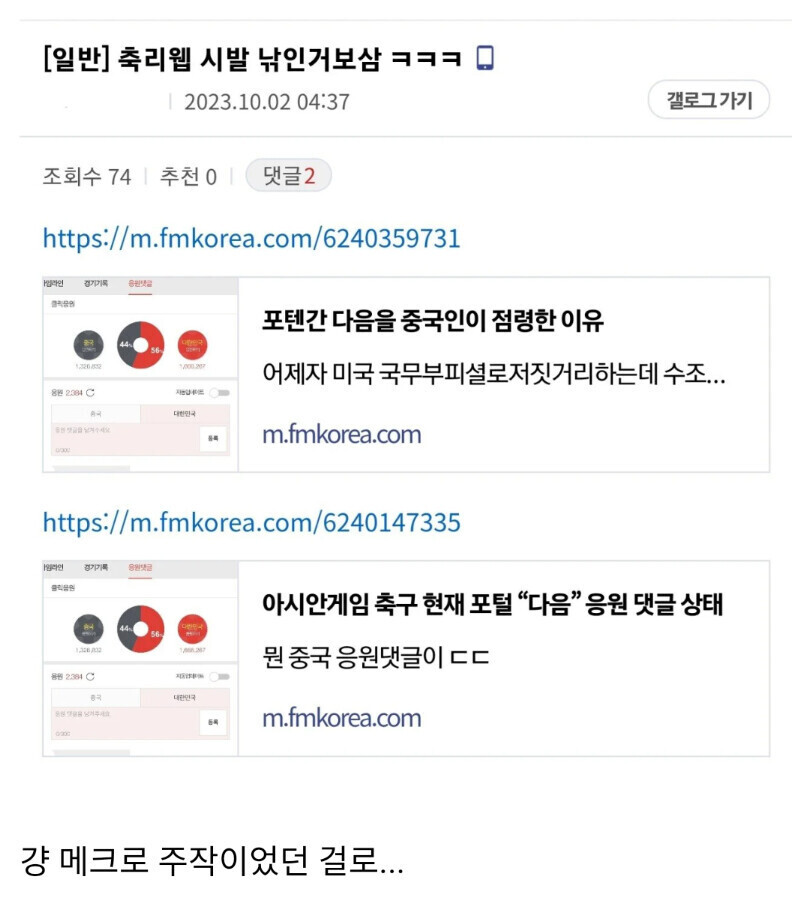 어느 유저가 다음에 중국 응원 숫자가 훨씬 많은 것을 발견함