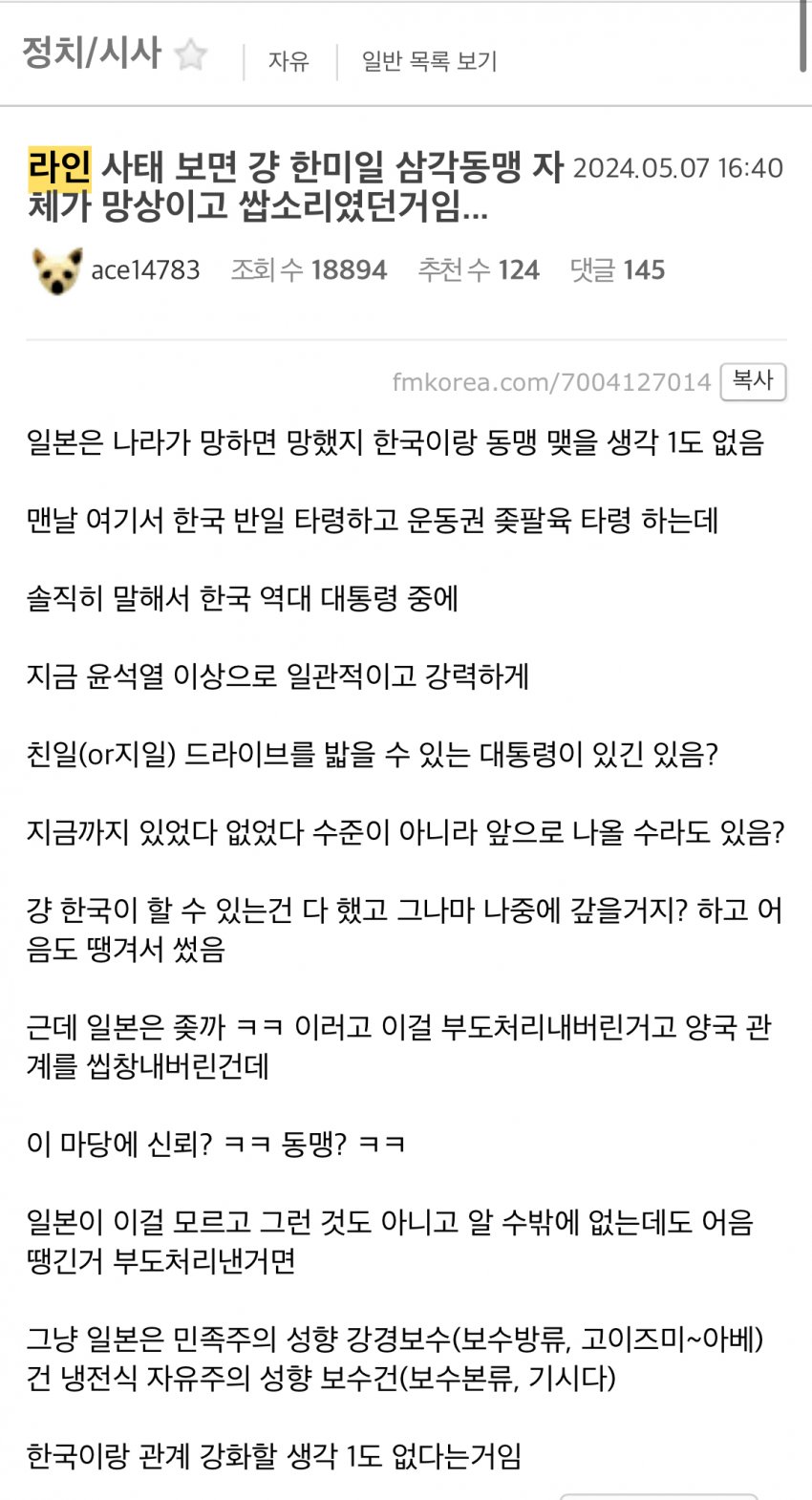 그런 상황이니 윤석열과 보수 진영은 일본이 아니라면, 일본이 한국에 적대하거나 해를 끼치고자 마음 먹는다면 한국의 생존은 위태롭게 될 것이니 일본을 달래고 환심을 사기 위해 무슨 짓이든 할 수 있는 자발적 봉건 노예 내지는 충성스러운 똥개 정도이기 때문에 벌어진 게 바로 현 라인 사태입니다.