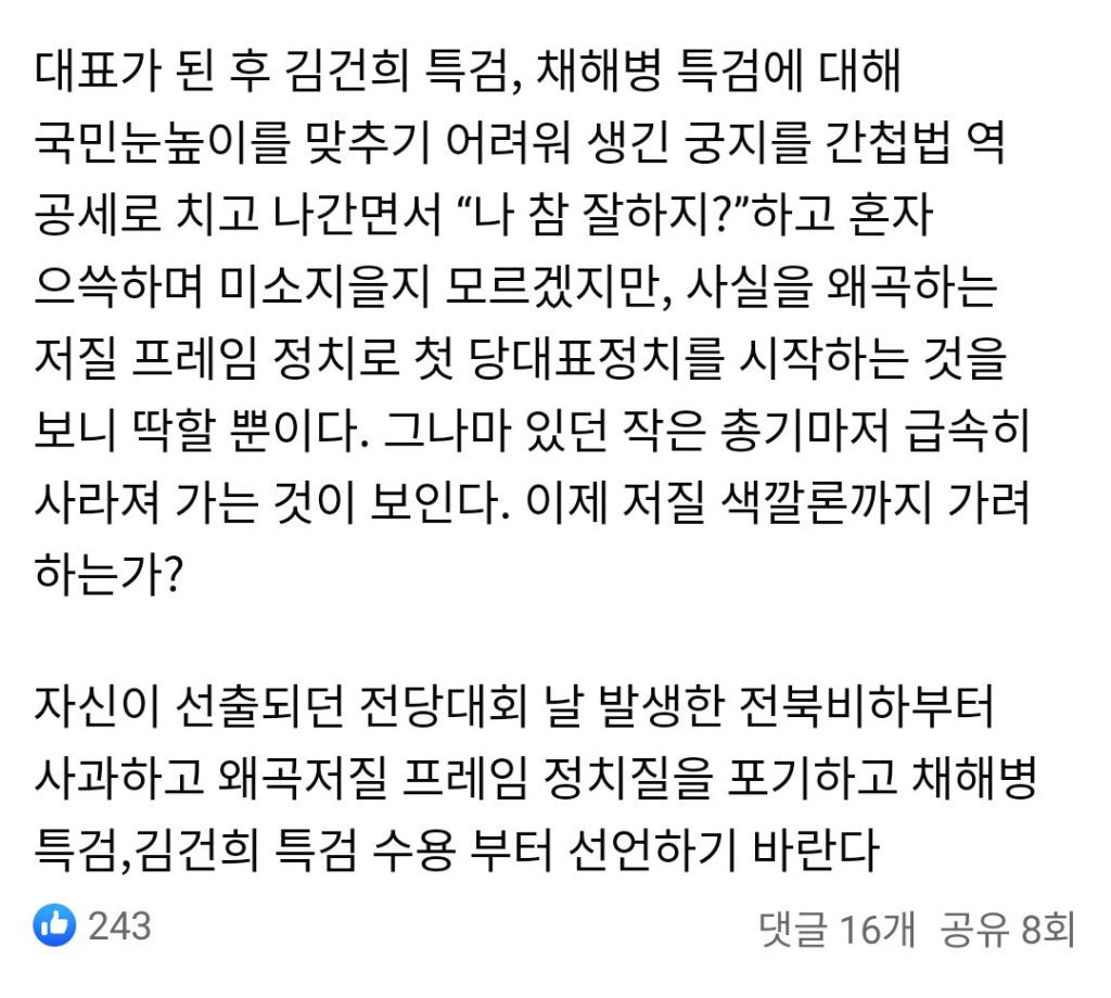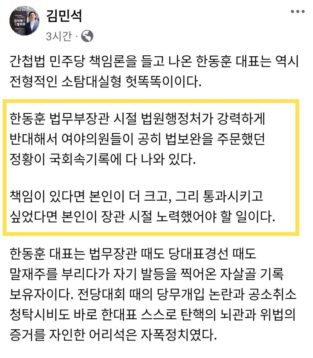 패배 전문가, 실패 전문가 한동훈은 지난 민주당 발목잡기식 정치질로 국익을 훼손하고는 그 책임을 또 남에게 넘기고 있음. 이런 거 보면 확실히 보수는 보수구나 싶음. 자기 책임을 남탓으로 돌리는 습성 꼬라지 하고는.
