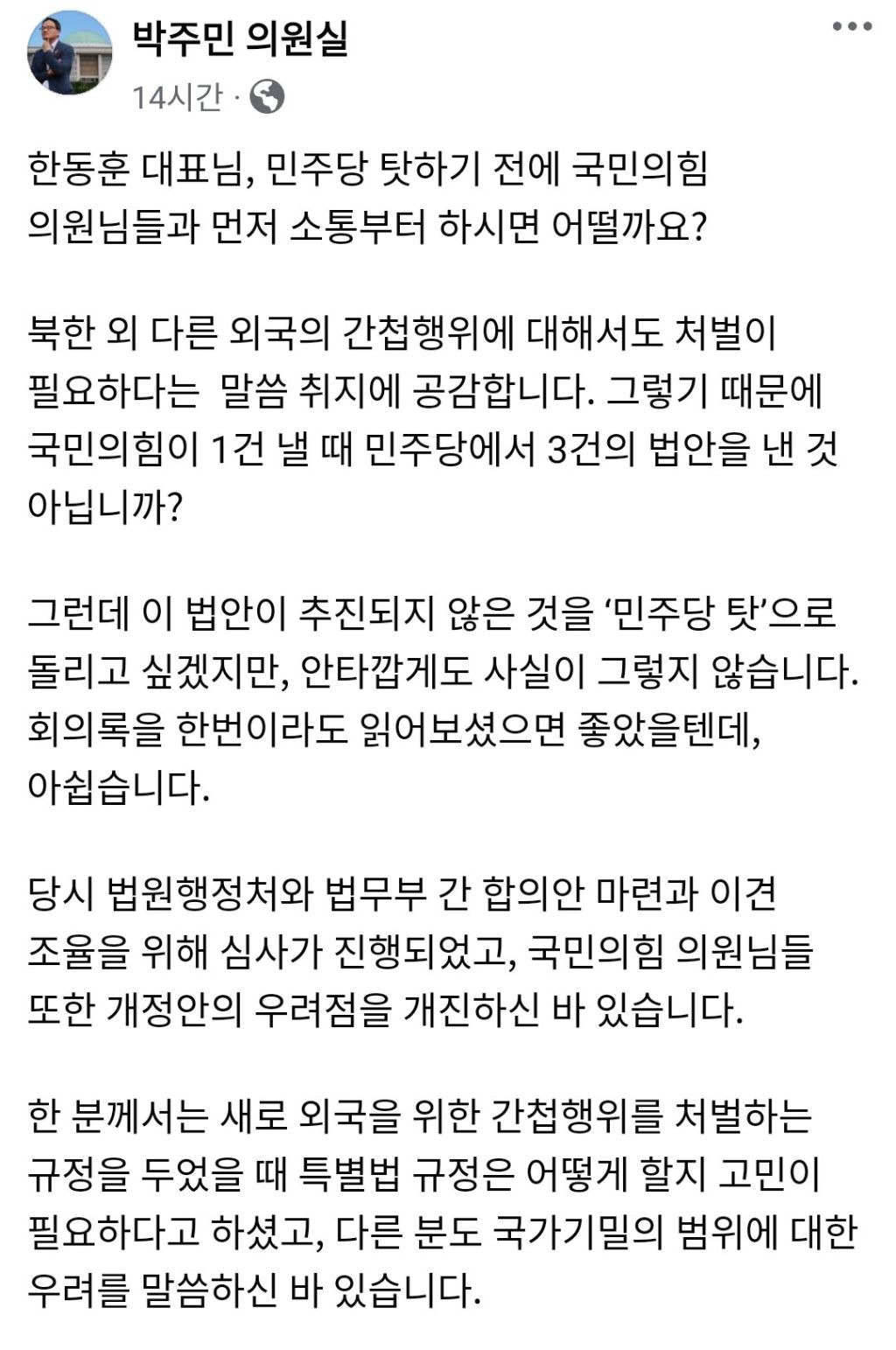 그러자 박주민 민주당 의원은 같은 날 페이스북에서 "민주당 탓하기 전에 국민의힘 의원님들과 먼저 소통부터 하시면 어떨까. 북한 외 다른 외국의 간첩행위에 대해서도 처벌이 필요하다는 말씀 취지에 공감한다. 그렇기 때문에 국민의힘이 1건 낼 때 민주당에서 3건의 법안을 낸 게 아니냐"며 "이 법안이 추진되지 않은 것을 '민주당 탓'으로 돌리고 싶겠지만, 안타깝게도 사실이 그렇지 않다"고 했다.