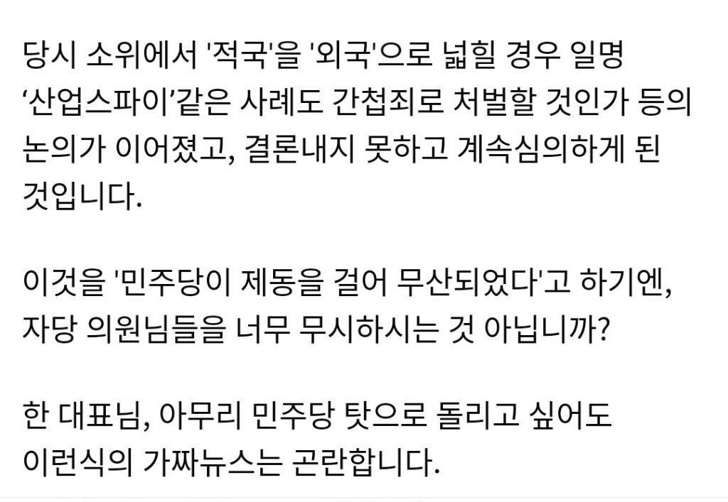 현행 형법상 간첩죄로 형사처벌을 하기 위해서는 국가기밀을 '적국'에 넘긴 사실이 증명돼야 한다. 한 대표는 이어 "이런 일이 중국, 미국, 독일, 프랑스 등 다른 나라에서 벌어졌다면 당연히 간첩죄나 그 이상의 죄로 중형에 처한다"면서 "지난 21대 국회 들어 적국을 외국으로 바꾸는 간첩법 개정안은 4건 발의됐는데, 3건을 민주당이 냈었다. 그런데 정작 법안 심의 과정에서 민주당이 제동을 걸어 무산됐다"고 덧붙였다.